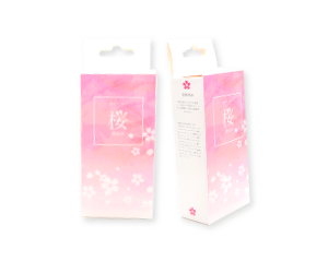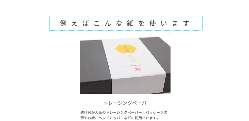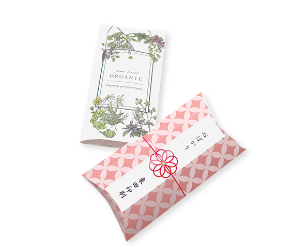 箱は既存の箱を使用し、印刷を施した帯を箱に巻き付けたパッケージデザインです。使用する紙は薄い紙から厚紙まで様々で、低コスト・小ロットからご注文いただけます。