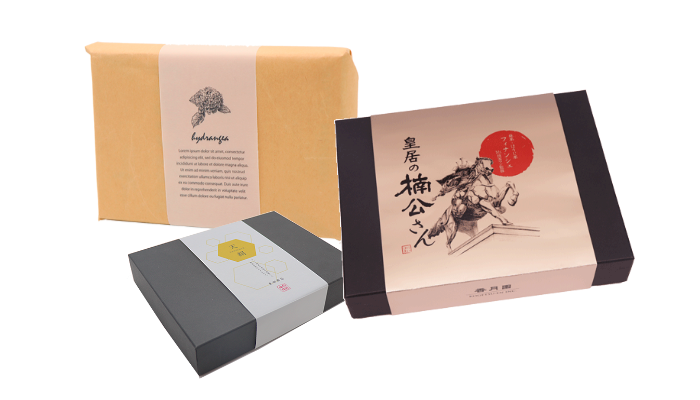貼り箱は厚いボール紙に印刷した紙を貼り付けし、組み立てて制作した箱で、蓋が上下に分かれています。厚紙はしっかりしているため郵送する可能性がある商品にも向いています。