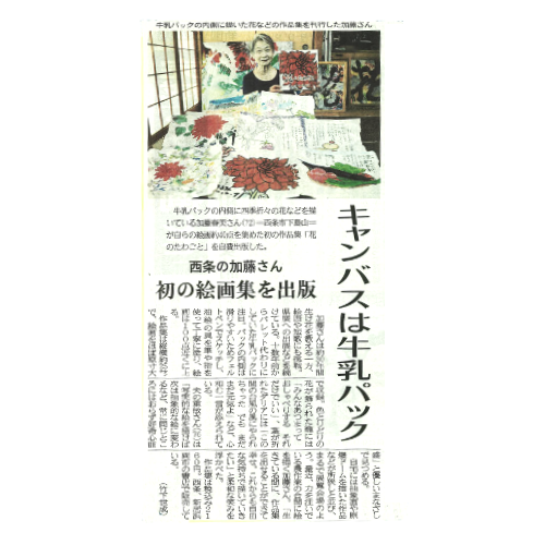 牛乳パックの内側に四季折々の花などを描いている加藤春美さん(72)=西条市下島山=が自らの絵画約40点を集めた初の作品集「花のたわごと」を自費出版した。
