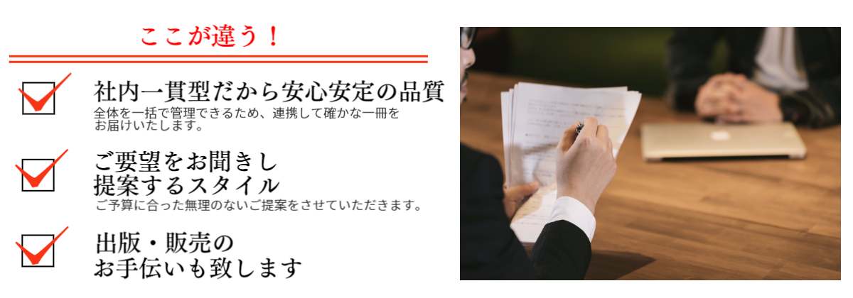 表紙のどこに題名をいれるか、著書名はどこにいれるか、写真はトビラにいれていいのか、ページ数はどこから入れればいいのか、など冊子には法則があります。的確な編集で[本物]を製作します。