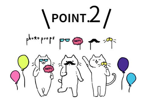 貸し出し物の返却を確認ののち終了となります。 ※Android端末の場合、撮影枚数が多いとアップロードに時間がかかりますので、ご退店後または後日にメール送信させていただく場合がございます。 ※場所を移動する場合がございます。ご了承ください。 |