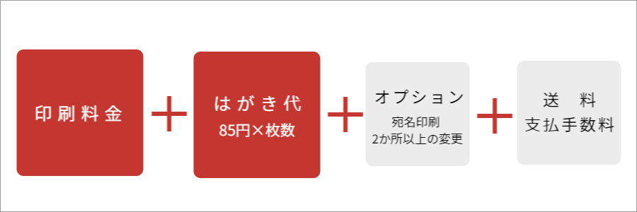 印刷料金(税込5,280円)+【はがき代85円×56枚(税込4,760円)】+オプション(税込605円)+ 送料(430円)*+振り込み手数料
