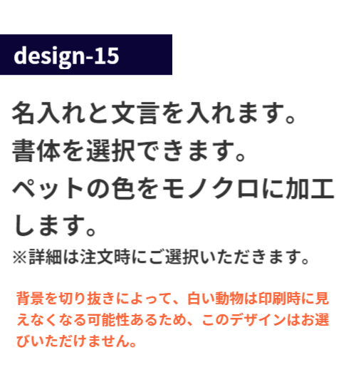 ・著作権を侵害するデザインについては取り扱いできませんのでご了承ください。※書体に関して、弊社が契約している書体以外の書体は書体名を指定していただいてもご利用いただけません。文字の画像をご用意ください。文字の著作権にご注意ください。