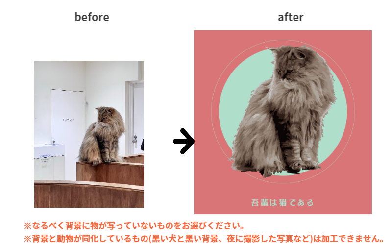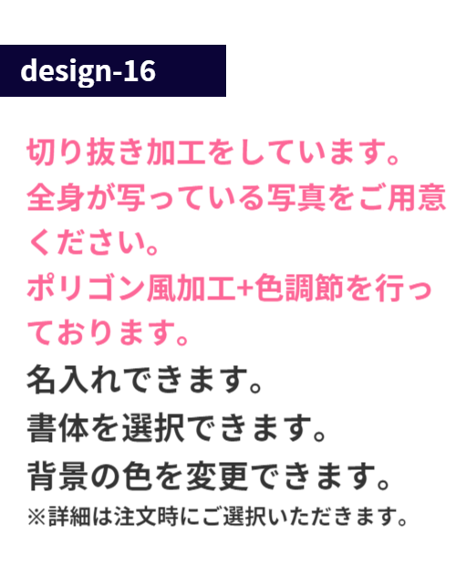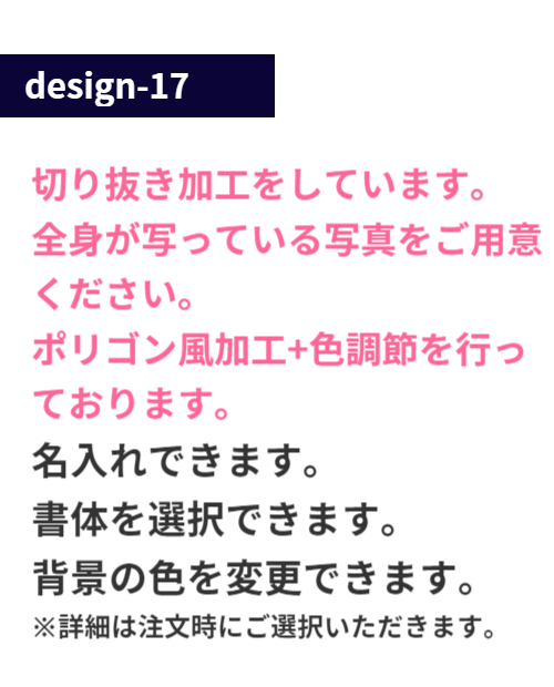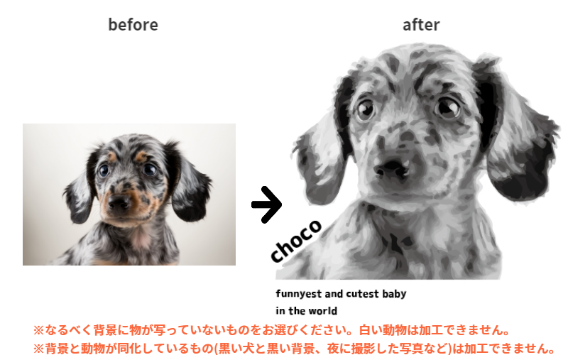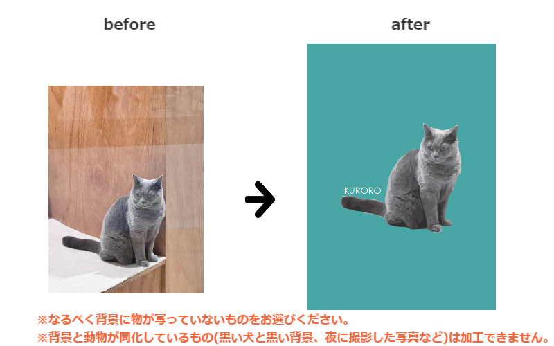 色味はお任せになります。細かい指定はできません。色調節の関係上、画面上でみる色味と実際プリントした色味は異なります。ご了承ください。※画質が悪いもの、写真の拡大、ピンぼけしている写真、見切れている写真、白飛びしている写真は綺麗に仕上がらない場合がございます。※人間の加工はできません。※生き物の色と背景が同化している写真は切り抜きがうまくできません。(白い犬と白い背景、夜に撮影した写真、輪郭がはっきりしていない写真など)