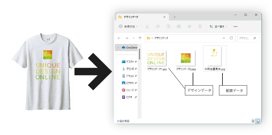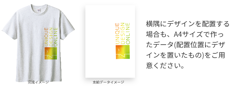 ・プリントのデザインは基本的に完全データ入稿をお願いします。データ作成方法を参照のうえ、それぞれの印刷範囲に合ったデータの作成をお願いします。データに不備があった場合、メールにてお知らせします。