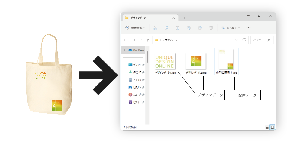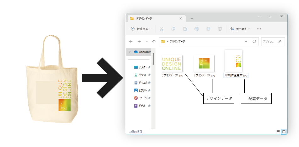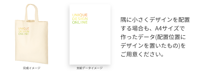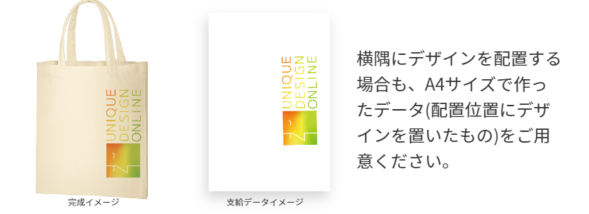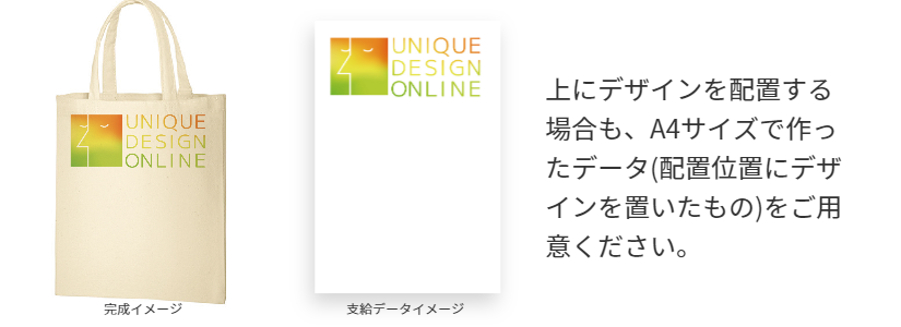 ・プリントのデザインは基本的に完全データ入稿をお願いします。データ作成方法を参照のうえ、それぞれの印刷範囲に合ったデータの作成をお願いします。データに不備があった場合、メールにてお知らせします。